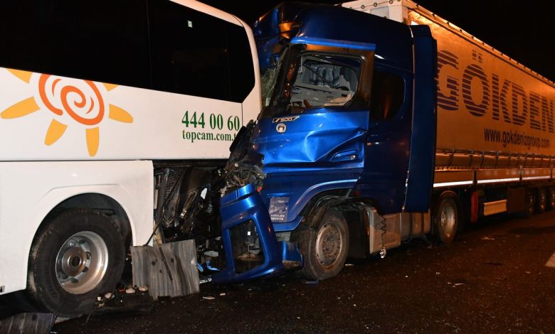 Bilecik’in Bozüyük ilçesinde, Bozüyük-Eskişehir karayolu Dodurga Kavşağı’nda meydana gelen kazada, kapısı kapanmadığı için emniyet şeridinde duran tur otobüsüne arkadan gelen bir tır çarptı.